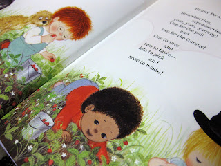 So what I’ve been trying to do as we read is simply model how a person makes connections with a text. Nothing crazy, nothing fancy, nothing super-wild. I’ll read a poem like “Berry Picking” from Bobbi Katz’s Poems for Small Friends (1989) and say, Oh I cannot wait to go strawberry picking this summer. It’s so hard to put those strawberries in our buckets without eating them, especially when they’re so red and ripe like the ones in this picture. Yum.
